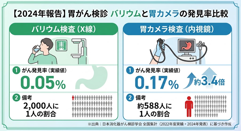 なぜ、胃カメラなのか。最大の理由は、シンプルに「がんを見つける能力」が桁違いだからです。