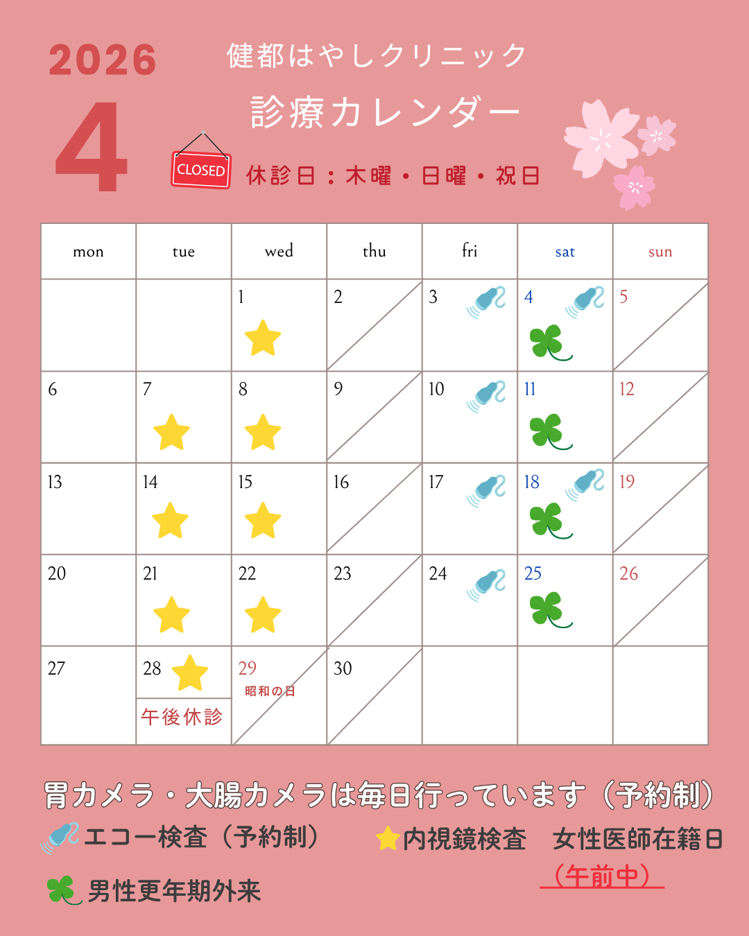 4月30日(木):休診 (通常休診日)